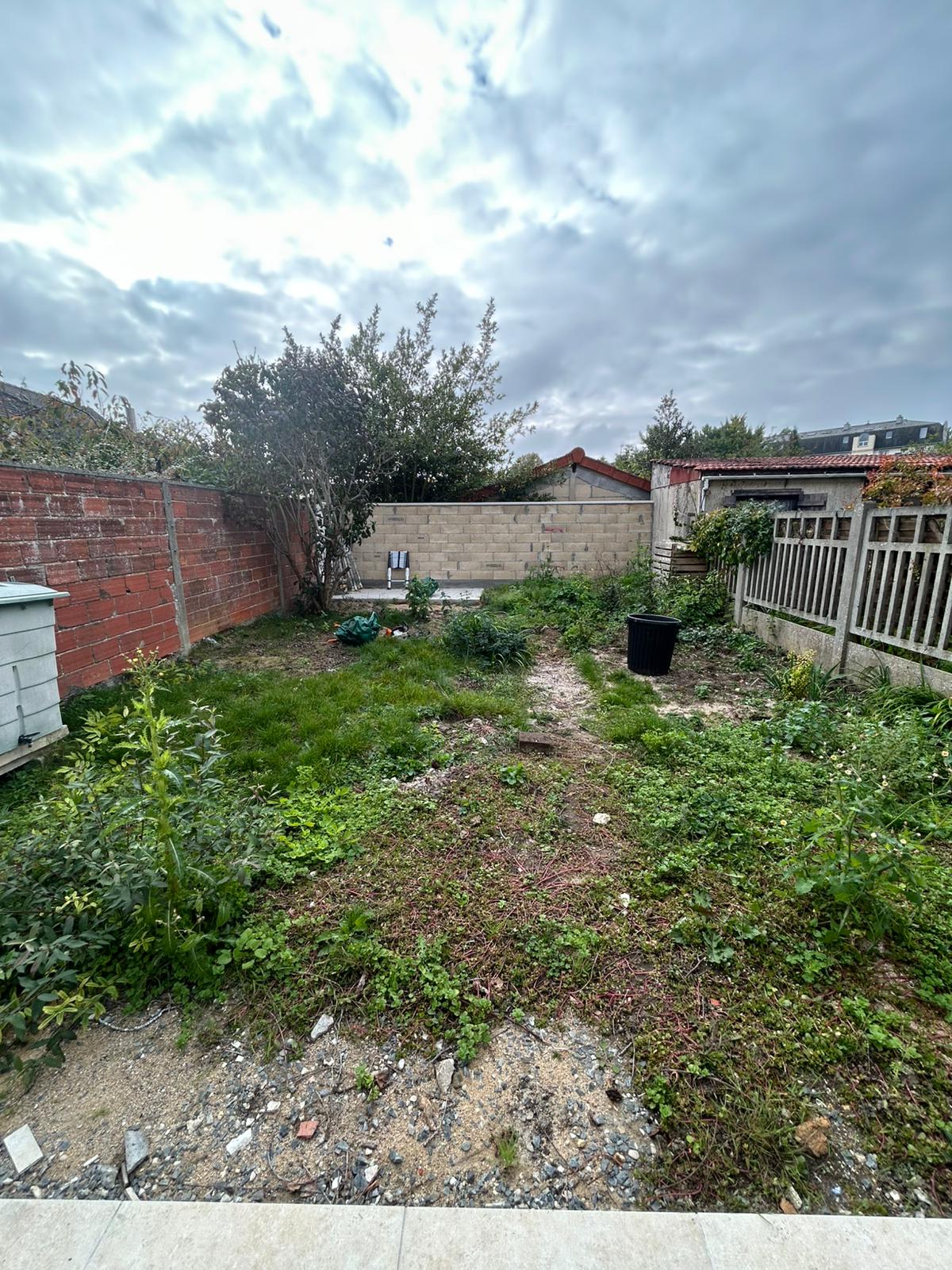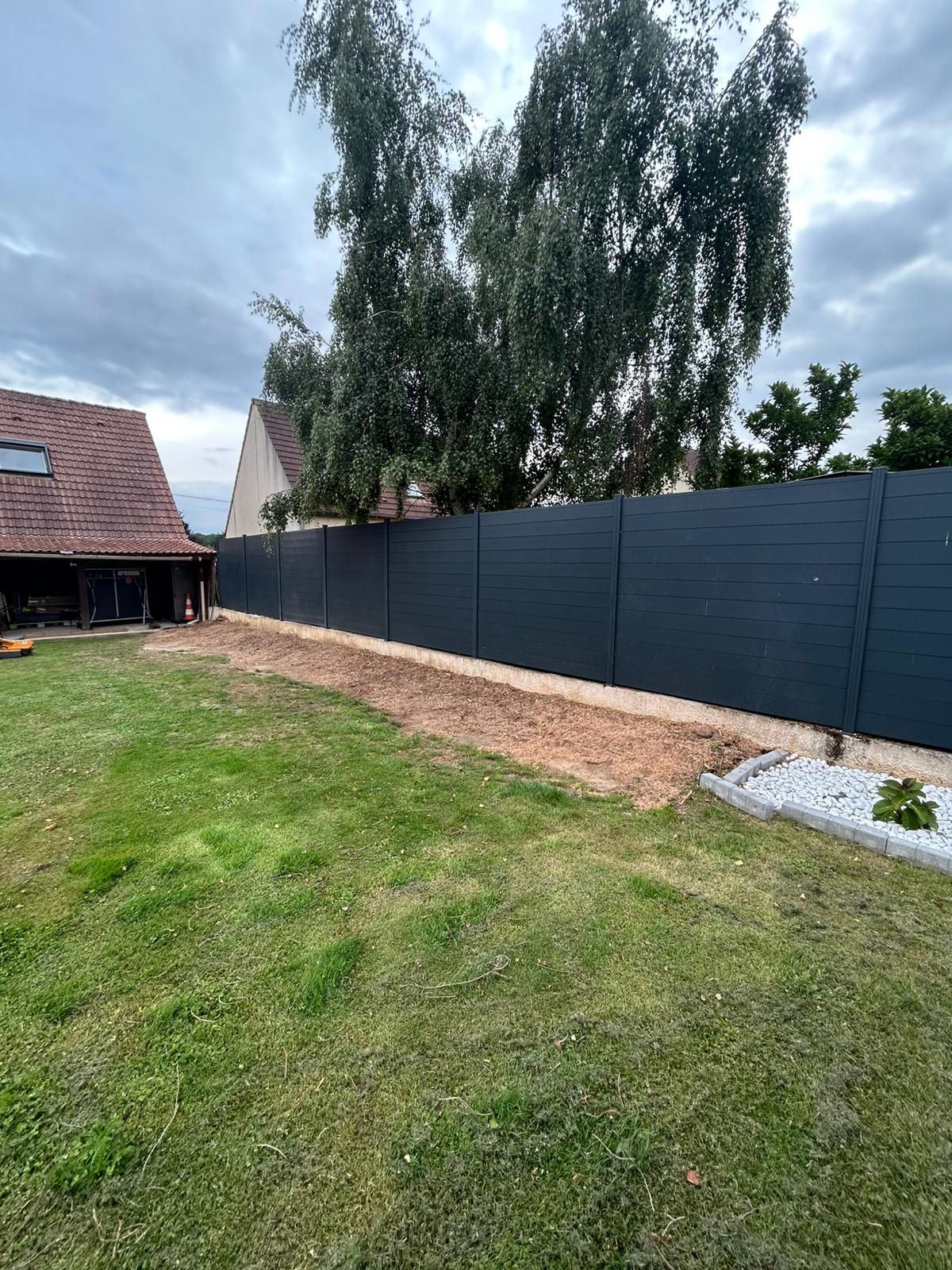 Le jardin était en friche totale : herbes hautes, pas de clôture, terrain bosselé. On a tout débroussaillé, nivelé, posé des panneaux composites anthracite et fini par du gazon.