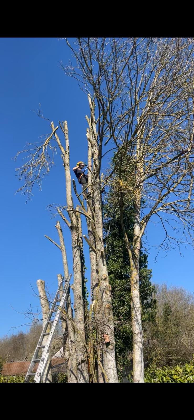 Élagage en grimpe avec harnais et cordes, démontage branche par branche. Broyage sur place.