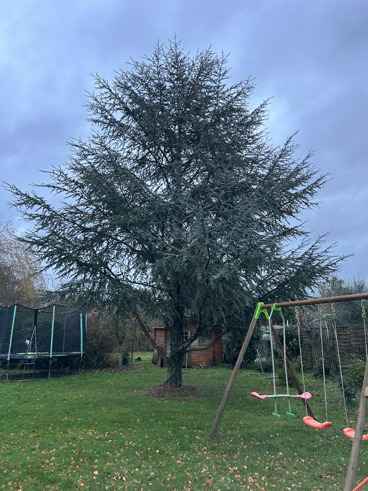 Arbres très hauts, proches de la maison et des câbles. Pas de place pour un engin.